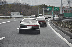 17:00頃、夕陽を受けながら一路本社へと東名高速を下るハチロクの一団。