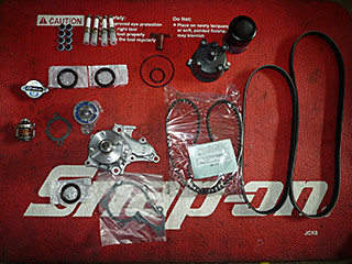 ウォーターポンプ・ラジエターキャップ・サーモスタット・サーモスタットG/K・スパークプラグ・カムシール・タイミングテンショナー・フロントクランクシール・オイルエレメント・タイミングベルト・ファンベルト・エアコンベルトを交換します。