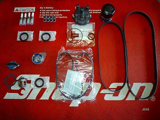 ラジエターキャップ・サーモスタット・サーモスタットG/K・カムカバーP/K・スパークプラグ・カムシール・タイミングテンショナー・フロントクランクシール・オイルエレメント・タイミングベルト・ファンベルト・エアコンベルトを交換します。