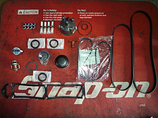 ラジエターキャップ・サーモスタット・サーモスタットG/K・カムカバーP/K・スパークプラグ・カムシール・タイミングテンショナー・フロントクランクシール・オイルエレメント・タイミングベルト・ファンベルト・エアコンベルトを交換します。